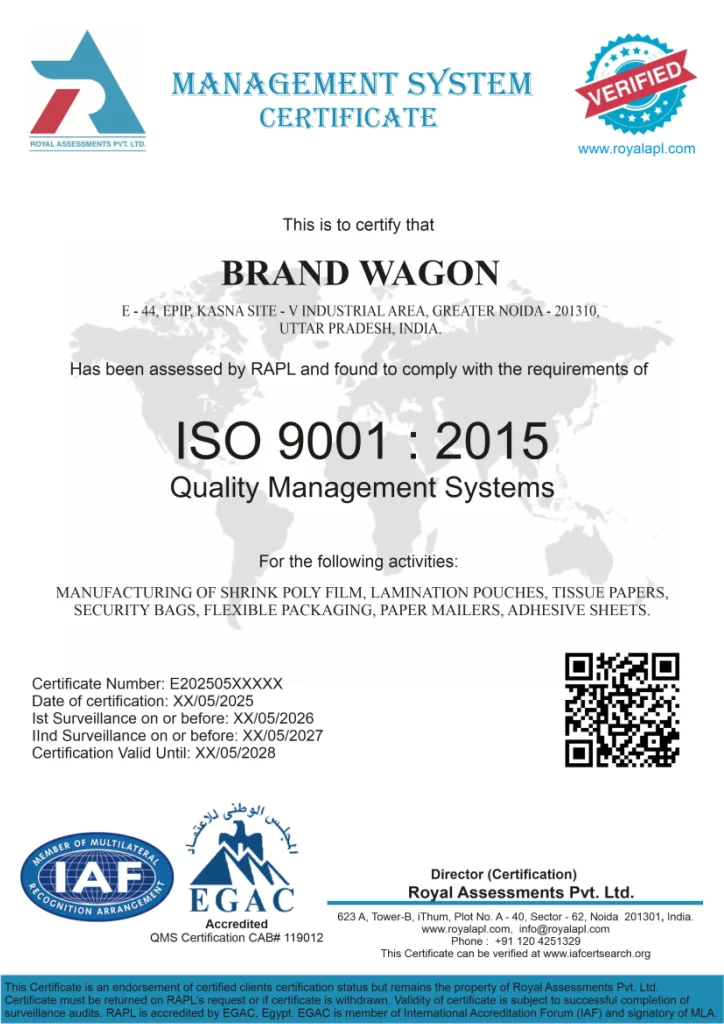As a leading provider of packaging solutions, Brand Wagon continually expands and updates its manufacturing capabilities. We regularly invest in the latest equipment for film extrusion, printing, and converting services. Our advanced infrastructure allows us to take on a wide range of projects with the highest standards of efficiency and quality. If you have any questions about our capabilities or would like to discuss specific requirements, feel free to reach out to a sales associate at +91 98105 55367 or mybrandwagon@gmail.com.